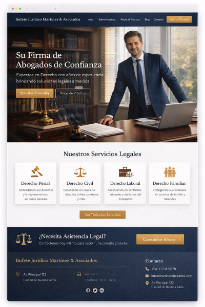 Diseño de Autoridad: Estética elegante y corporativa que refleja la sobriedad y el prestigio de tu práctica legal.